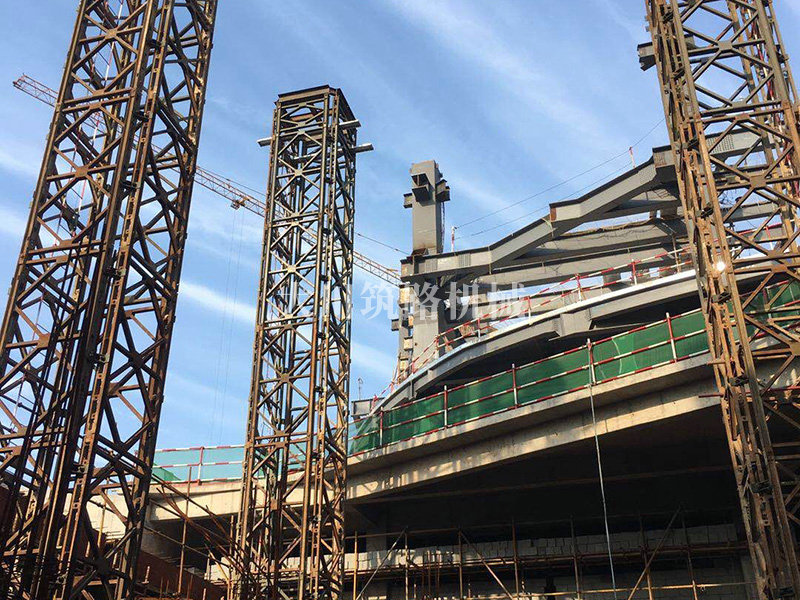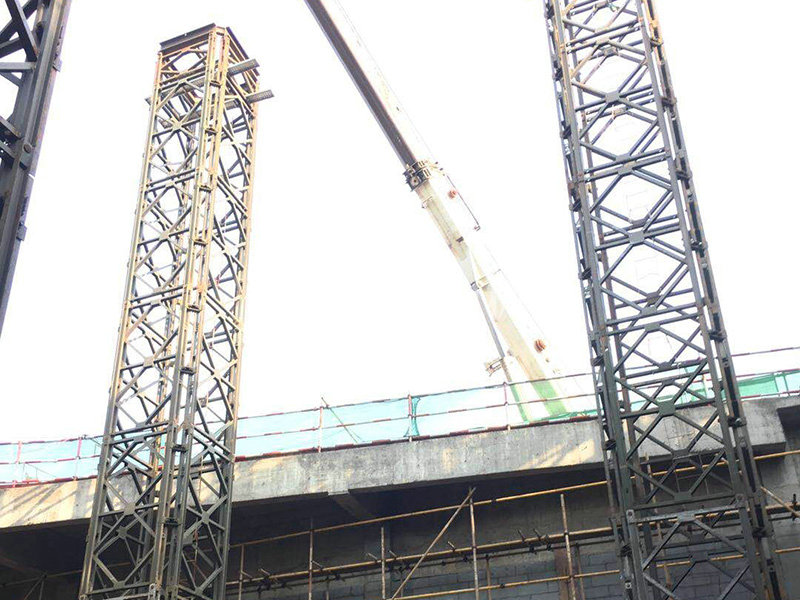 基本情況:部分構(gòu)件工廠組裝好,分片運(yùn)輸至現(xiàn)場。采用4片321型貝雷片組合而成的貝雷方柱作為大跨度鋼桁架下部的臨時支撐胎架,待上部鋼桁架安裝完成后分級卸載,最后分片拆除。拆卸后鋼桁架撓度符合要求。貝雷方柱支撐胎架高度達(dá)20m,支撐荷載約50t。
